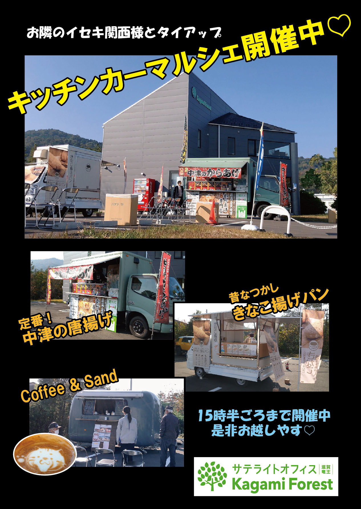 ※写真はイメージです お知らせ 駐車場でキッチンカーマルシェ開催中 2022/11/12 お隣イセキ関西様のイセキフェアも最終日。本日いよいよ当施設駐車場でイセキ関西様のキッチンカーマルシェ開催!朝から唐揚げのいい匂いがだだよっています。15時半ごろまでの開催ですのでお近くの方はぜひお越しください。